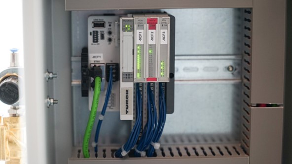 Turck desarrolló dos soluciones alternativas para STS: una con HMI y el sistema BL20 I/O con controlador integrado, y otra en la que el controlador está integrado en la HMI y el BL20 funciona solo como I/O. La ventaja es que, si hay problemas de suministro con un componente, se puede elegir la combinación alternativa de HMI y sistema E/S.